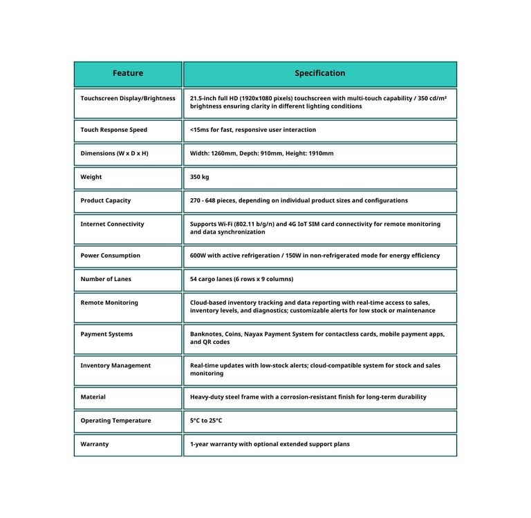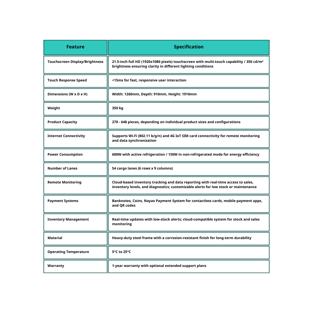 The VG 21.5" Vending Machine offers a modern solution for high-traffic areas, featuring a 21.5-inch HD touchscreen for easy, interactive selection. With Wi-Fi/4G connectivity, multi-payment options (cash, card, mobile), and cloud-based monitoring, it delivers a seamless vending experience. Its adjustable refrigeration supports temperature-sensitive items, and a high-capacity design (270+ items) allows diverse product offerings. Reliable and energy-efficient, the VG 21.5" is ideal for businesses looking to enhance service and efficiency.
